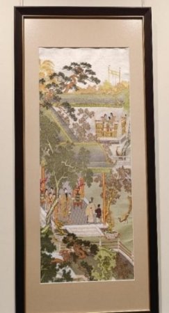 Əl ilə ipək üzərində tikilmiş Çin panoları dekorativ sənətin gözəl nümunəsi olaraq təqdim olunmuşdur. Klassik Çin bağları və zadəganların təsvir olunduğu panolarda memarlıq elementləri, şam ağacı, bambuk, alim fiqurları və saray əhli yer almışdır. Bu panolar həm dekorativ məqsədlə, həm də status simvolu kimi istifadə olunmuşdur. "Müdrik kişi" obrazı ilə işlənmiş digər bir panoda isə uzun qaşlar uzunömürlülüyü simvolizə etmişdir.